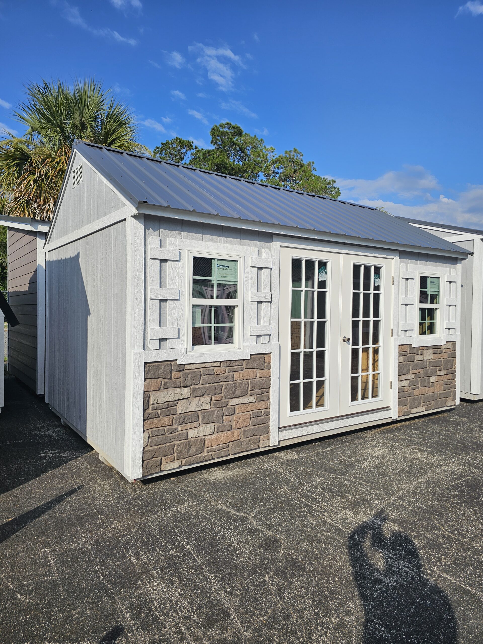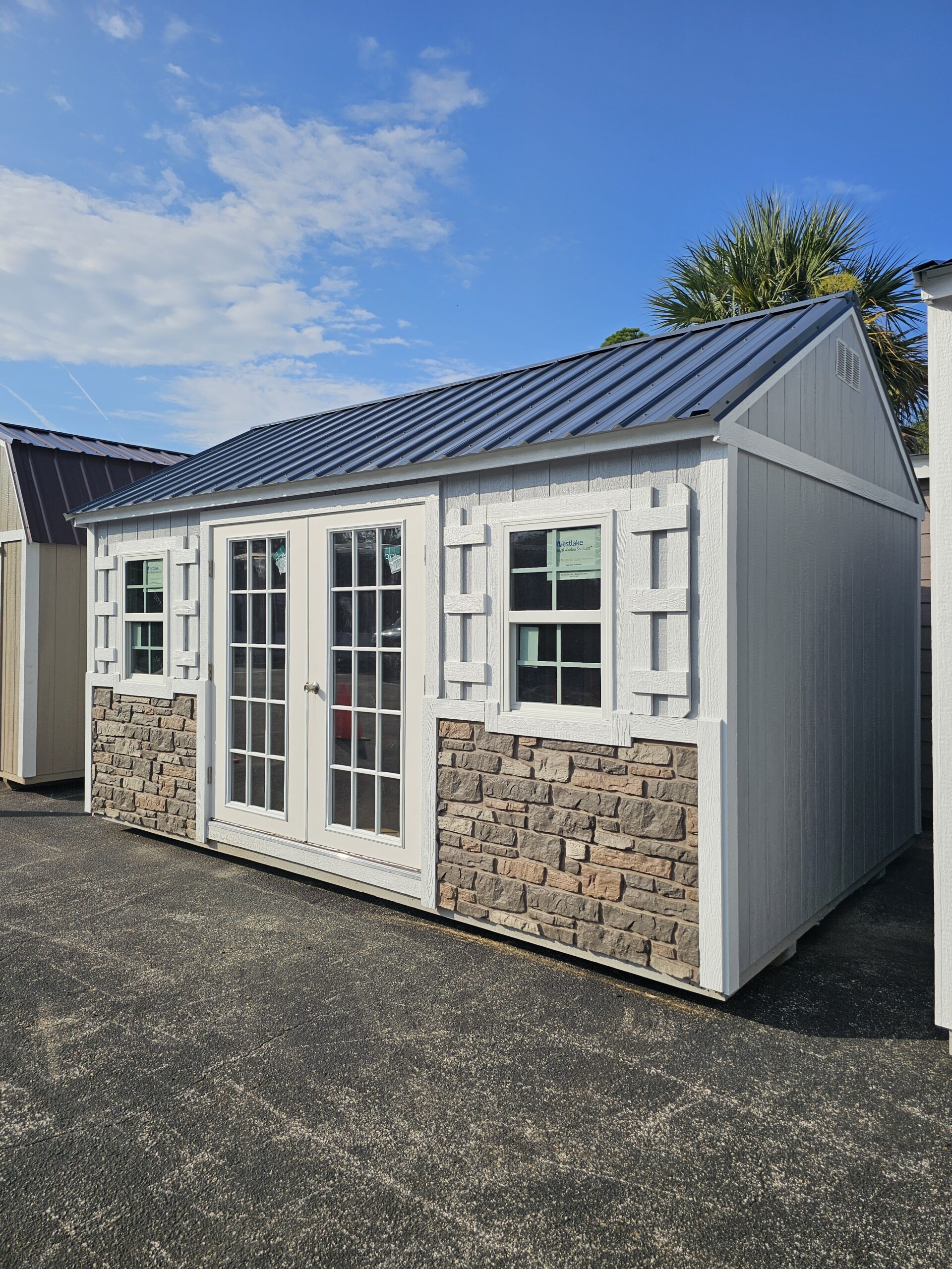 6′ French Door, (2) 2×3 Insulated Windows, Shutters, Stone Facade